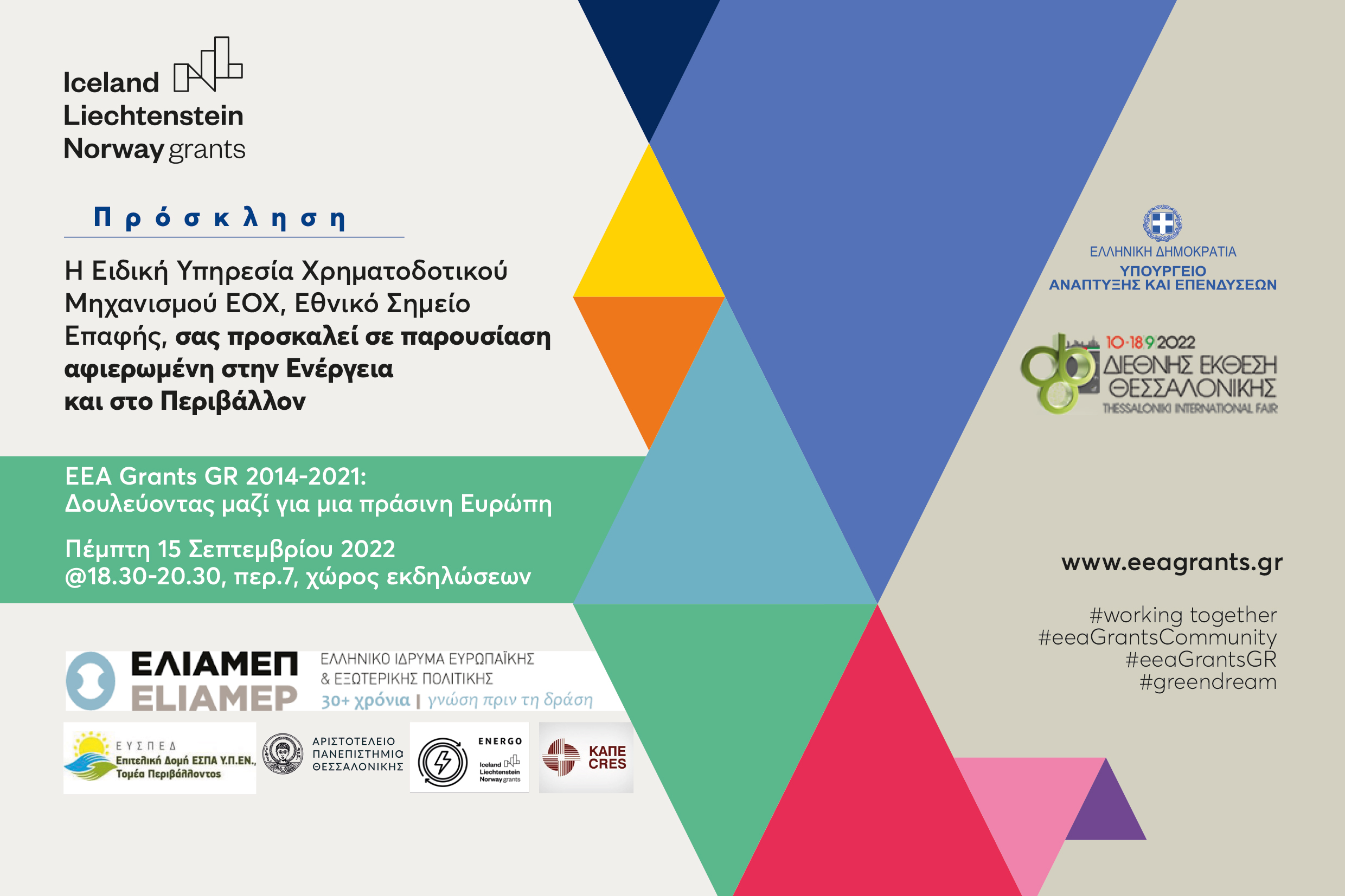 Την Πέμπτη, 15 Σεπτεμβρίου και ώρα 18.30-20.30, θα παρουσιαστούν, στην 86η Διεθνή Έκθεση Θεσσαλονίκης, οι πρωτοβουλίες των EEA Grants για το Περιβάλλον και την Ενέργεια από: